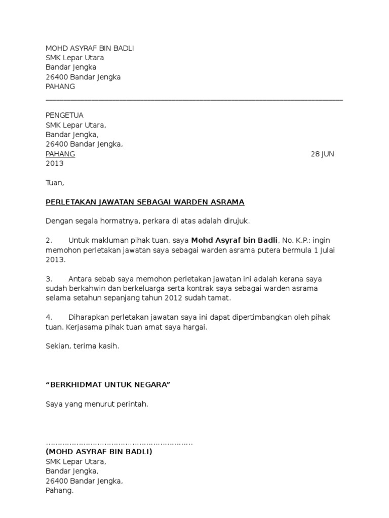 Contoh surat letak jawatan ajk contoh surat. 4 contoh surat letak jawatan ikut situasi notis 24 jam 2 minggu sebulan versi bm. Contoh lain seperti ahli jawatankuasa persatuan penduduk setiausaha ajk kelab ajk surau ajk masjid warden asrama ahli umno dan lain lain lagi. Contoh surat berhenti kerja terbaik yang mudah dan ringkas. Muat turun surat letak jawatan 338 kakitangan kerajaan letak jawatan.