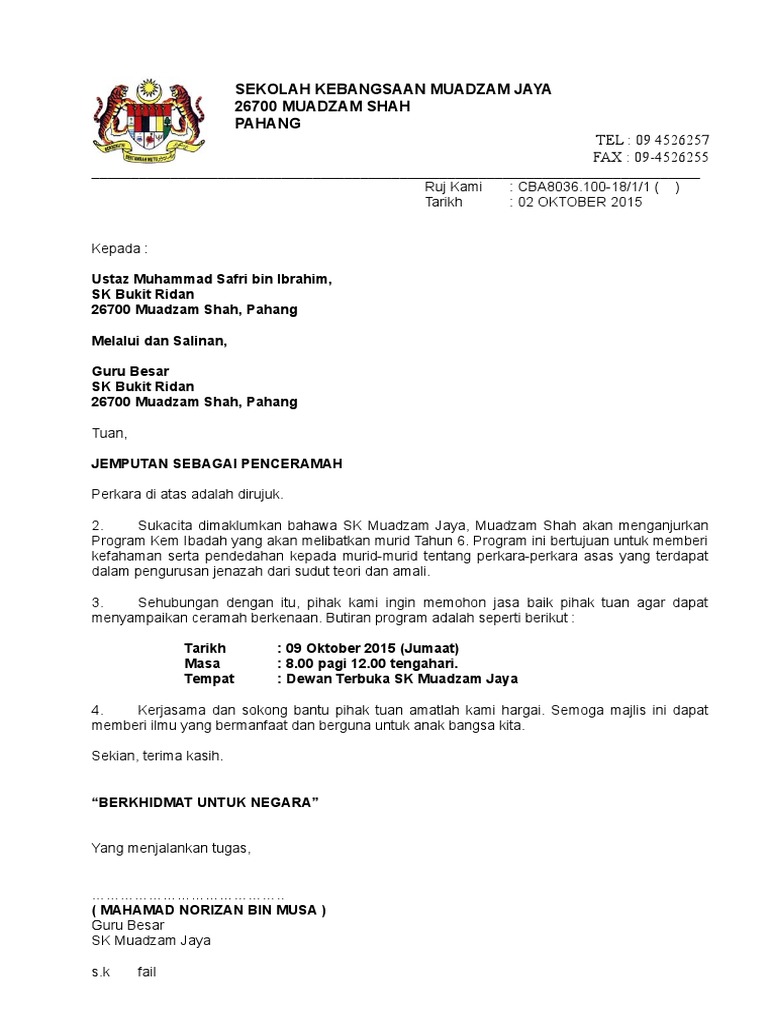 Contoh Surat Memohon Penceramah Kursus Jenazah